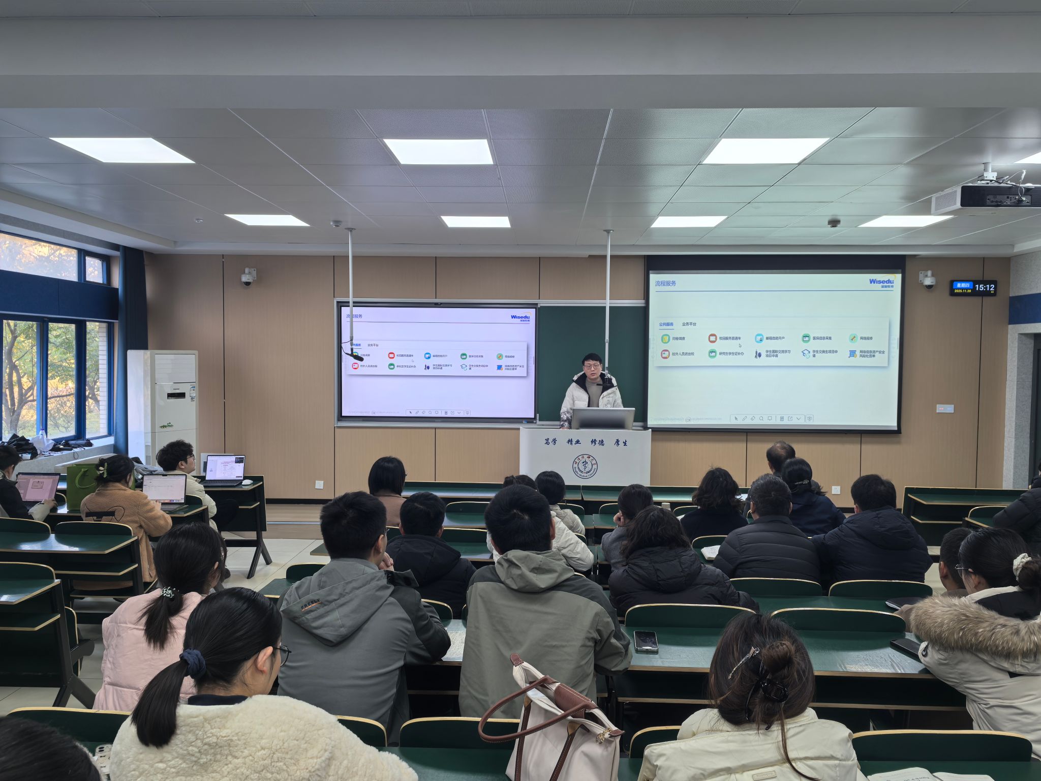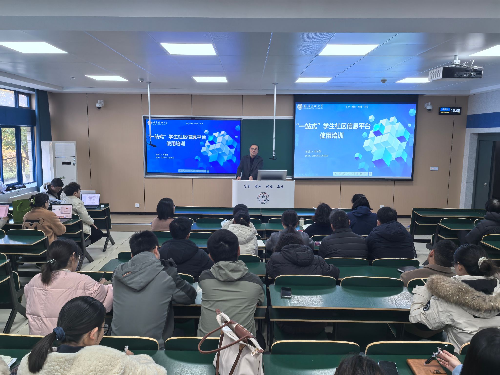 11月20日下午,学生处在理论教学楼206教室举办“一站式”学生社区信息平台使用专题培训,学生处副处长吴涛主持,全体辅导员参会。