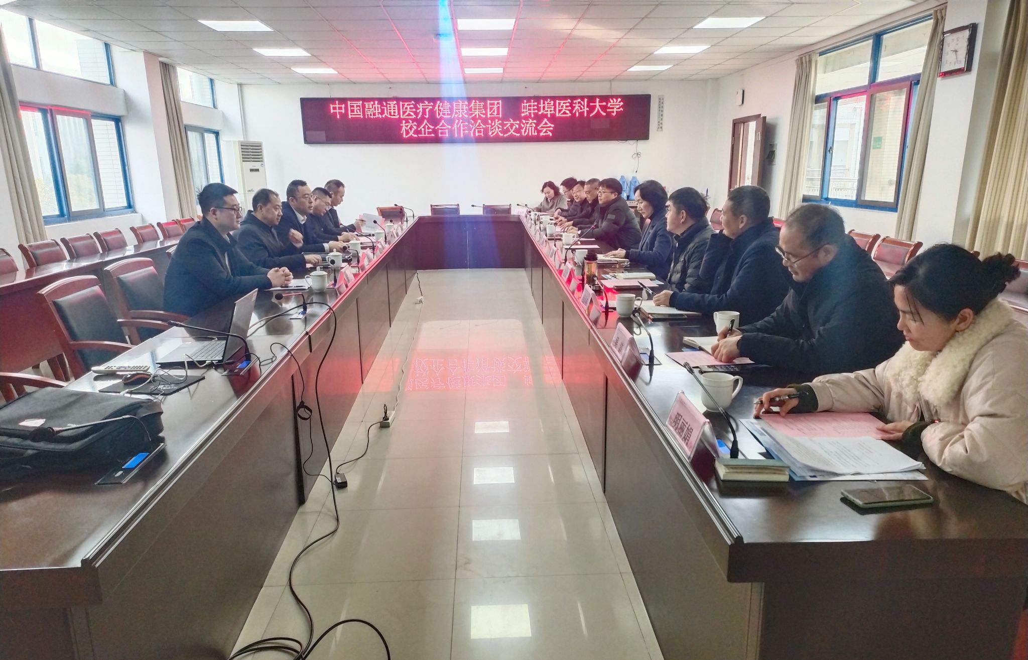 中国融通医疗健康集团安庆一一六医院、正定二五六医院、信阳一五四医院、淄博一四八医院等单位相关负责人,与我校各学院学生工作负责人就学生实习就业、临床技能培养、校企交流合作等具体事宜交换了意见,达成了多项合作共识。